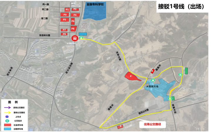 1號門:出園游客在冰雪新天地1號門(天健路公交車臨時站點)乘坐接駁2號線公交車返回地鐵霧開河大街站B口,換乘停車場擺渡車,返回臨時停車場。(如下二圖)