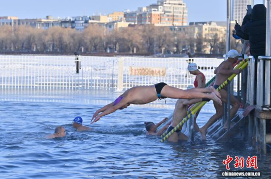 吉林長春:冬泳愛好者冰湖暢游迎新年