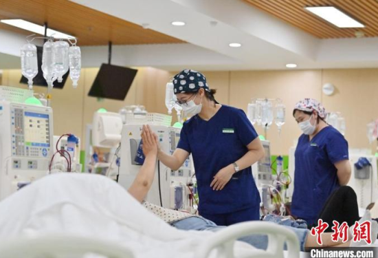 5月9日,長春中醫(yī)藥大學(xué)附屬醫(yī)院腎病科門診透析室內(nèi),護(hù)士在為患者加油打氣!埇 攝