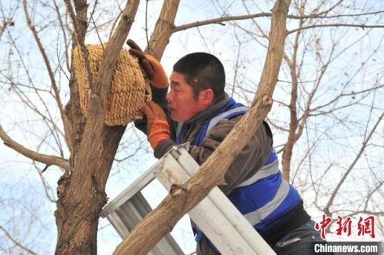 11月23日,趁著雪后天晴,吉林長春友誼公園的工作人員忙著維護樹上的草編鳥巢,并投放了鳥糧。該公園生態(tài)環(huán)境好、野生鳥類多,園方已經(jīng)連續(xù)三年在園區(qū)設(shè)置百余個草編鳥巢助鳥類安全過冬。