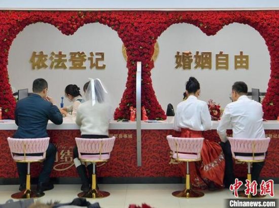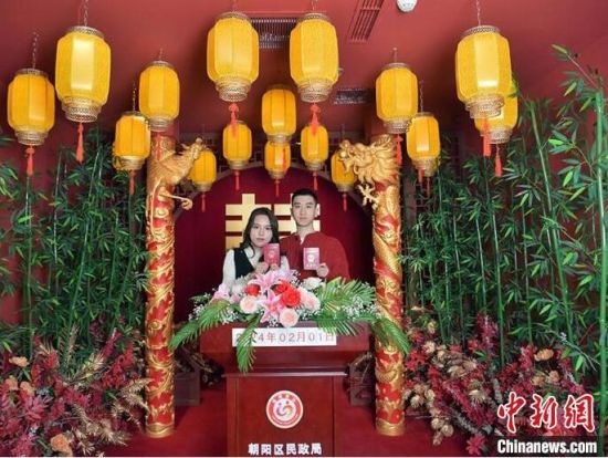 2月1日,在長(zhǎng)春市朝陽(yáng)區(qū)婚姻登記處,多對(duì)新人在辦理結(jié)婚登記。該婚姻登記處近日打造了三種不同風(fēng)格的拍攝場(chǎng)景,并為新人準(zhǔn)備了鮮花、婚紗以及特色服裝等,給前來(lái)登記結(jié)婚的新人一個(gè)大大的驚喜。