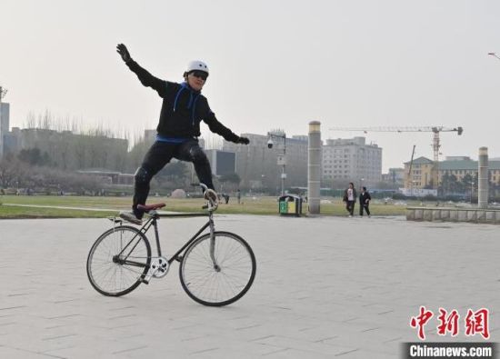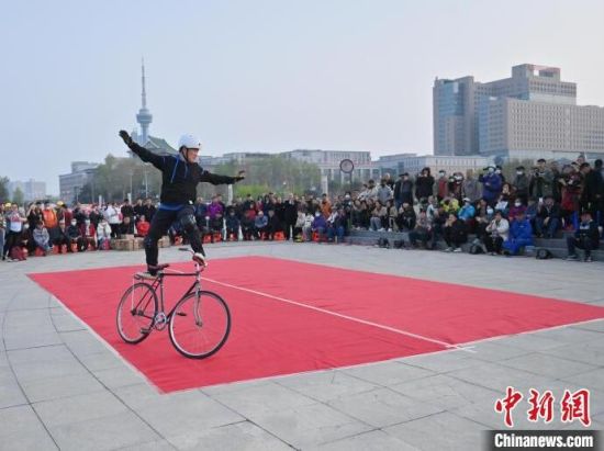 4月24日,在長(zhǎng)春市文化廣場(chǎng)內(nèi),64歲的市民周長(zhǎng)春表演自行車花樣絕技。站立騎行、脫把騎行等一系列驚險(xiǎn)刺激的動(dòng)作被周長(zhǎng)春完成得十分精彩,吸引市民圍觀。