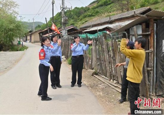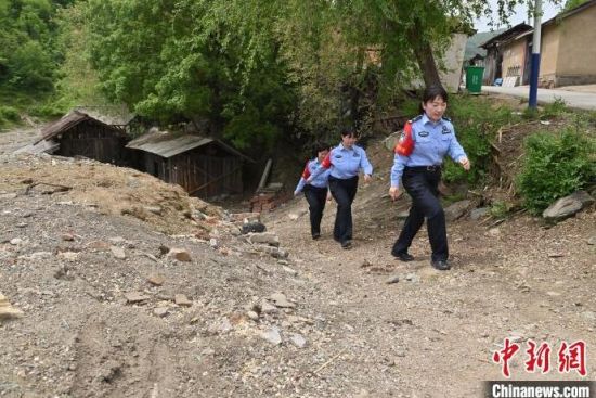 “女子警務團”來到村里走訪。崔藝琳(右一)說,轄區(qū)里很多村子道路難行,但從沒阻止她們前行的腳步!埇 攝