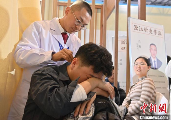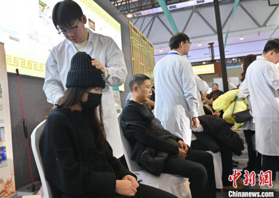 12月7日,吉林長(zhǎng)春,市民在體驗(yàn)推拿。當(dāng)天,2024長(zhǎng)春國(guó)際醫(yī)藥健康產(chǎn)業(yè)博覽會(huì)開(kāi)幕,現(xiàn)場(chǎng)設(shè)有中醫(yī)藥文化體驗(yàn)展區(qū)、中醫(yī)流派特色療法體驗(yàn)館,吸引大批市民前來(lái)觀展、體驗(yàn)。中新社記者 張瑤 攝