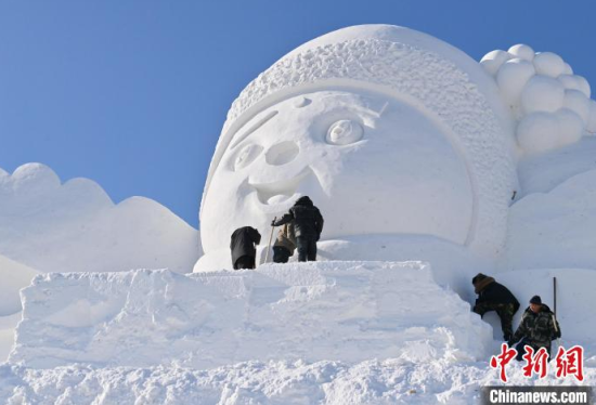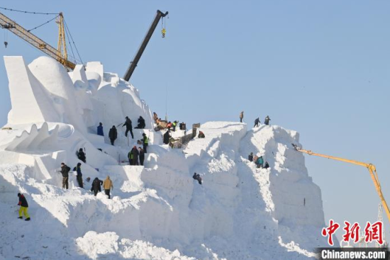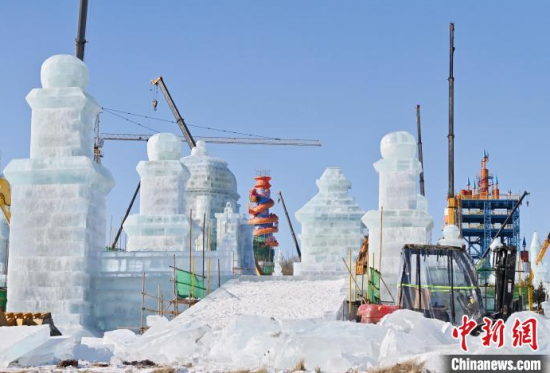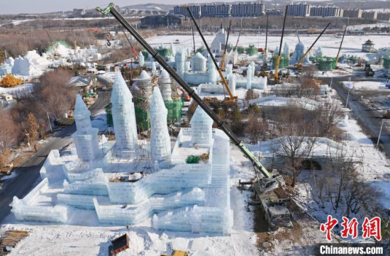 12月11日,吉林長(zhǎng)春,工作人員正在長(zhǎng)春冰雪新天地緊張施工。今年長(zhǎng)春冰雪新天地總占地面積達(dá)到156萬平方米,冰雪雕塑200組創(chuàng)歷屆之最,并設(shè)置1314米的空中雪漂流、520米的冰滑梯等設(shè)施供中外游客游玩。中新社記者 張瑤 攝