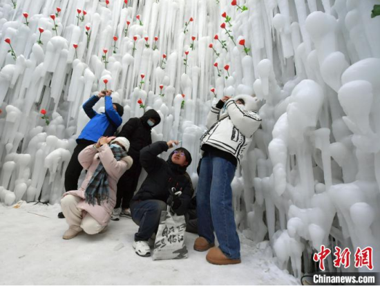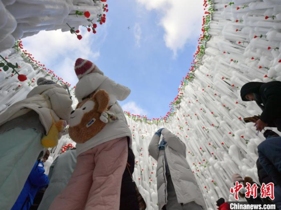 12月26日,吉林長白山,游客在冰洞內(nèi)打卡。進入雪季,長白山推出“愛心冰封玫瑰”吸引大量游客打卡拍照,冰洞內(nèi)被玫瑰道具環(huán)繞,洞頂呈心形,充滿浪漫氣息。