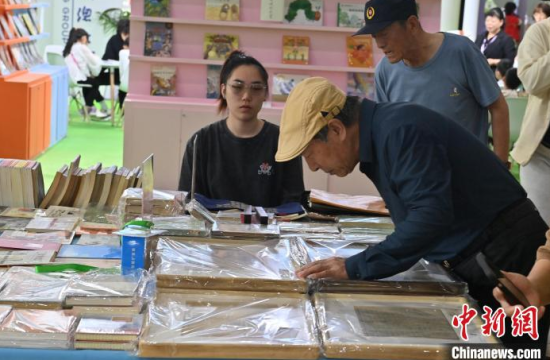 5月16日,吉林長春,市民在第二屆東北圖書交易博覽會上選購舊書。本屆東北書博會首次設(shè)立“舊書新知”(東北專場),匯聚了近千種古籍舊書、名家墨跡手稿、特裝書等,吸引不少市民關(guān)注選購。中新社記者 張瑤 攝