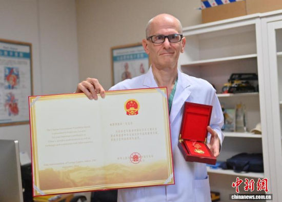 10月17日,吉林長春,意大利醫(yī)生拉瓦若展示患者送他的錦旗。十年前,他作為國際志愿者與長春結(jié)緣,被當(dāng)?shù)貙iT救助貧困心臟病患者的“吉心工程”所打動,決定留下。近日,他榮獲中國政府友誼獎。他表示將繼續(xù)留在長春,培育青年醫(yī)生、優(yōu)化診療體系,讓更多患者擁有“心跳的力量”。中新社記者 張瑤 攝