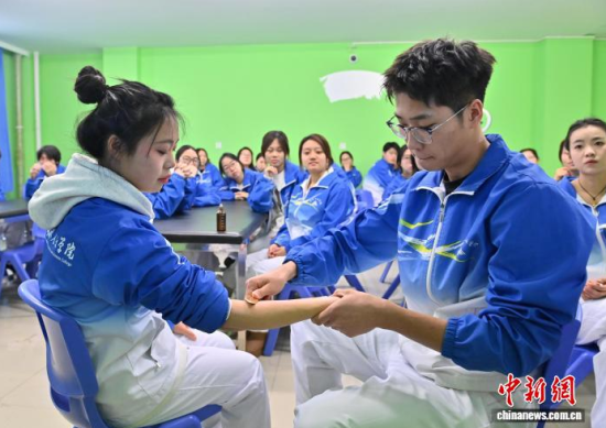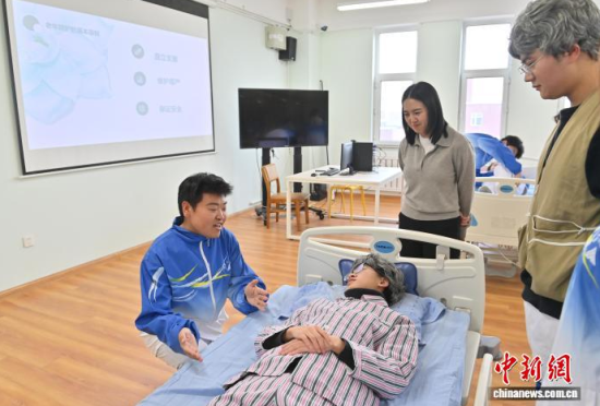 12月15日,在長春人文學(xué)院,學(xué)生在實操介護技術(shù)。面對老齡化進程與銀發(fā)經(jīng)濟發(fā)展,該校開設(shè)了養(yǎng)老服務(wù)管理專業(yè),融合管理學(xué)、心理學(xué)、護理學(xué)等,設(shè)置介護福祉綜合實訓(xùn)、老年康樂活動策劃與實施綜合實訓(xùn)、智慧養(yǎng)老實務(wù)等近30門課程,培養(yǎng)既懂運營管理又具備實操技能的復(fù)合型人才,吸引年輕人投身這一“朝陽產(chǎn)業(yè)”。中新社記者 張瑤 攝