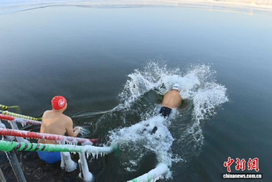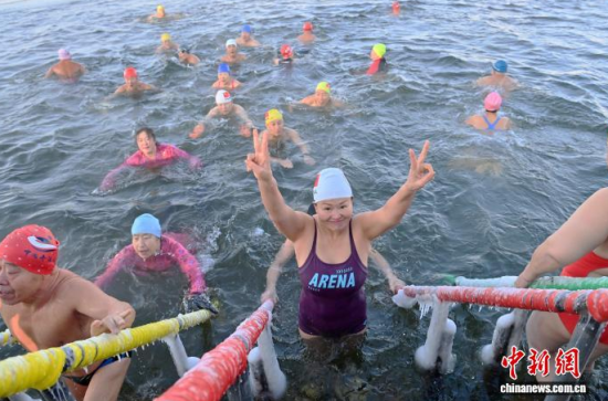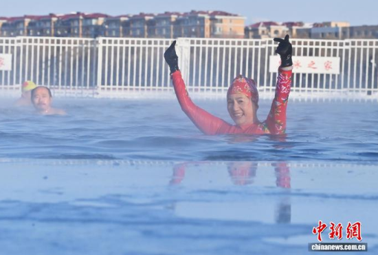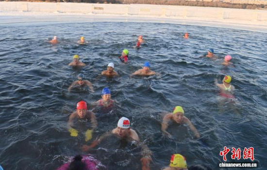 吉林長春:冬泳愛好者冰湖暢游迎新年