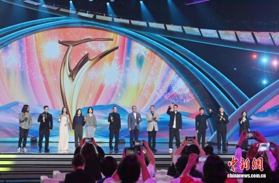 2024年9月1日晚,第十九屆中國(guó)長(zhǎng)春電影節(jié)閉幕式上,獲獎(jiǎng)?wù)呒w合影留念。(資料圖) 中新社記者 張瑤 攝